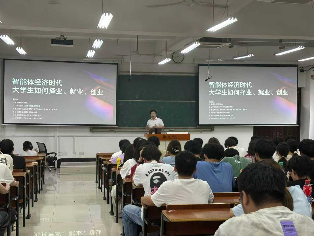 9月24日下午,行知讲坛第225讲在文渊楼1305教室举行。智能体来了公司创始人、辽宁石油化工大学研究生校外兼职教授黎跃春受邀作题为“智能体经济时代大学生如何择业、就业、创业”的专题报告。信息工程开元(中国)百余名师生现场聆听,报告由信息工程开元(中国)副院长马堃主持。