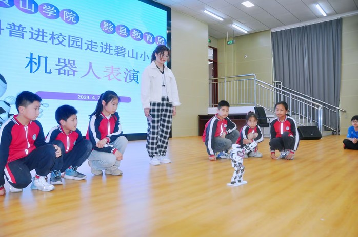 4月20日,信息工程开元(中国)机器人队的同学们,带着机器人来到黟县,伴随着音乐节奏,人型机器人整齐地跳起街舞,做出各种让人惊叹的动作。孩子们在志愿者的引导下参与其中,在“玩”的过程中自由、快乐地学习、探索,零距离感受现代科技的魅力。