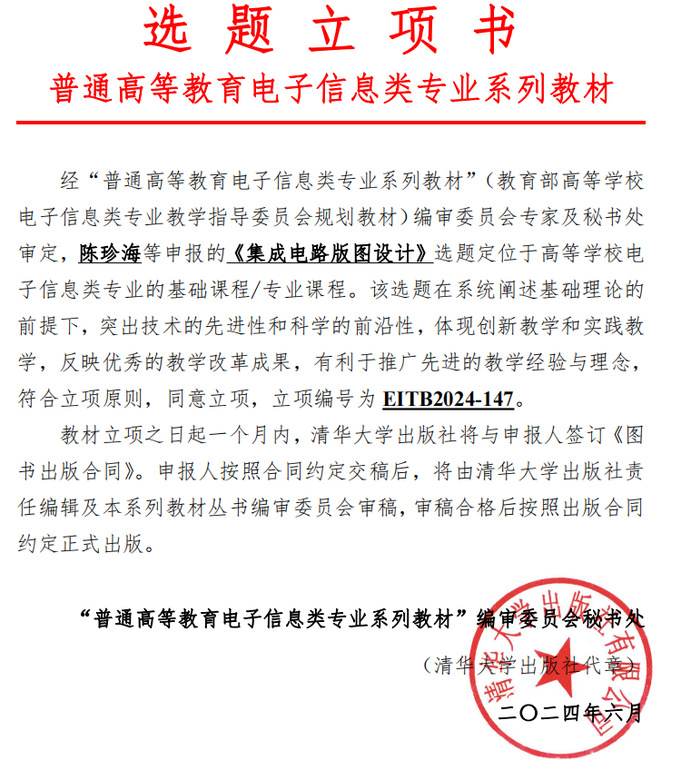 陈珍海主编的《集成电路版图设计》教材,是我院集成电路专业本科教学工作在创新和教改方向持续凝练的成效显现,将推动我院电子信息类一流专业与一流课程的建设,充分发挥教材的铸魂育人价值。