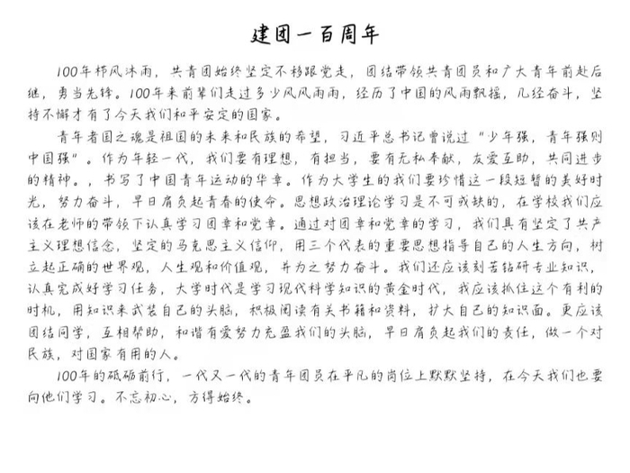 此次线上征文吸引了300多名同学参加。在提交的作品中,有的回顾了共青团的百年历程,有的借此表达了对“建团一百周年”的祝福,还有的同学更是规划着要全面提升自己,争取早日成为一名中国共产党党员,为人民贡献自己的一份力量。