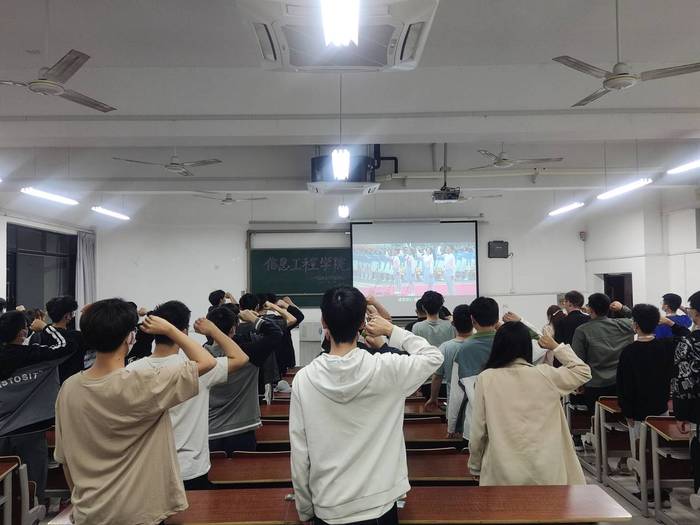 各团支部通过集体观看五四相关视频、影片,在扣人心弦的气氛中,了解五四运动始末,感受五四青年的爱国精神。观看影片之后,各团支部组织团员们重温入团誓词,,“我志愿加入中国共产主义青年团,坚决拥护中国共产党的领导,遵守党的章程……吃苦在前,享受在后,为共产主义事业而奋斗”,宣誓声在教室内回荡。
